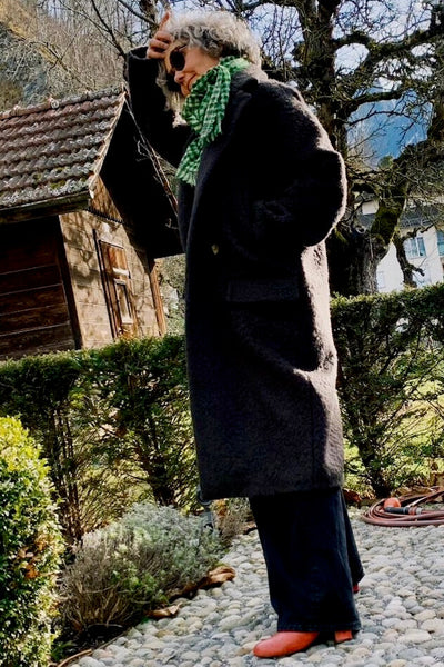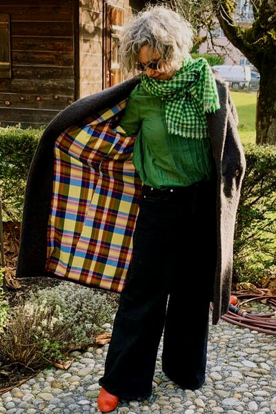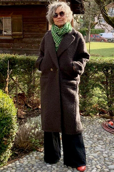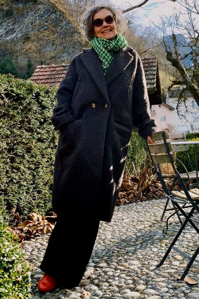 • Christina hat sich ihren beigen Mantel in Grösse 38/40 genäht. Sie trägt den Mantel mit Jeans und Sneakers. Den zweiten Mantel hat Christina sich in schwarz-weißem Pied de Coq von Zuleeg genäht.
